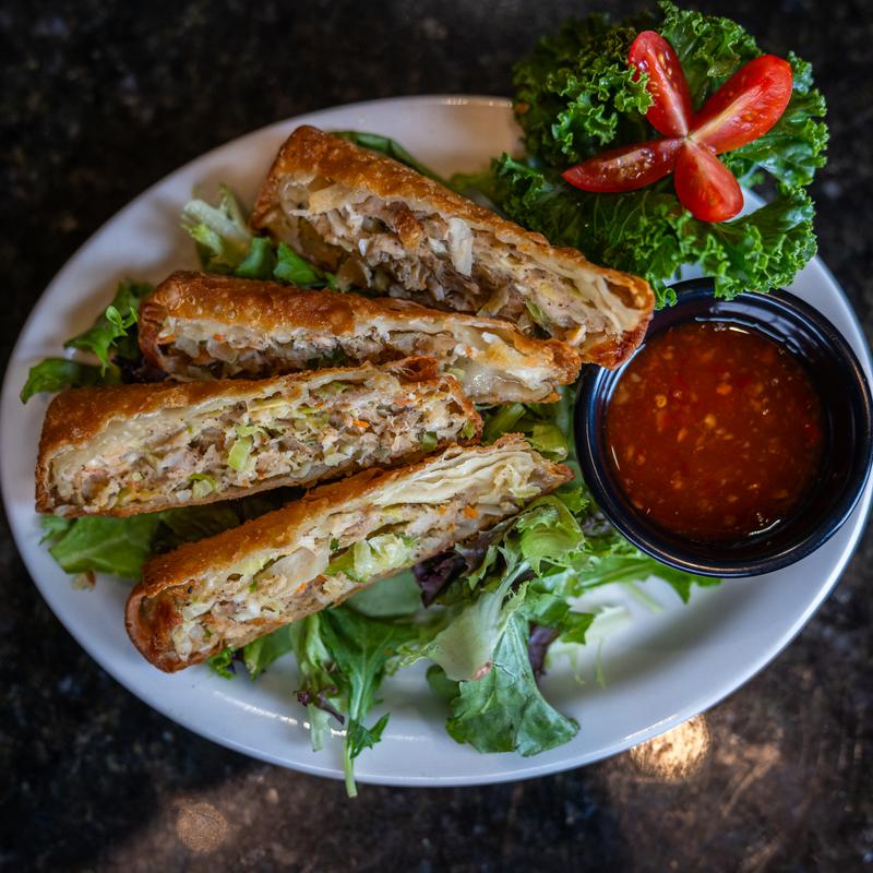 Hand-made cabbage and vegetable-filled rolls with sweet Thai chili sauce.
